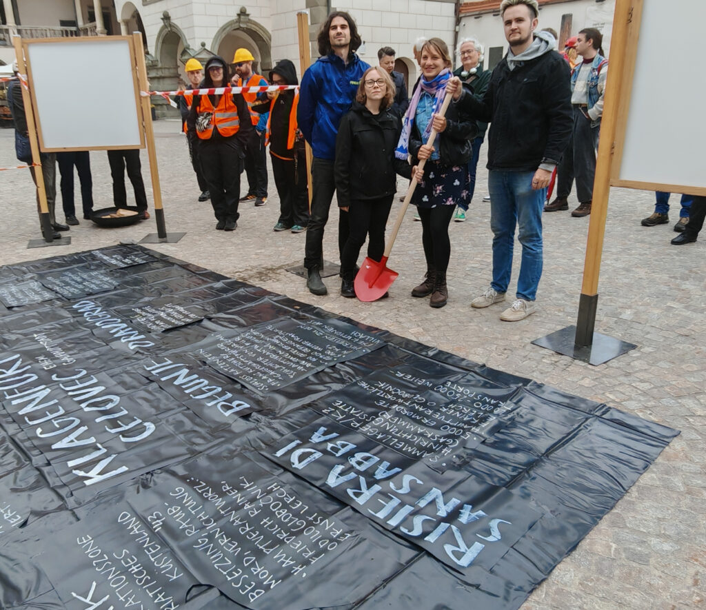 Vielen Dank allen, die sich von der Wettervorhersage nicht abschrecken ließen und solidarisch dabei waren, den Jugendlichen, die allseitig geholfen haben, und natürlich der Künstlerin Dana Rausch, die ihre schwarze Mahn-Plane vor Ort fertiggestellt und das symbolische, (noch) nicht enthüllte Denkmal in Rot für den Widerstand aufgestellt hat.